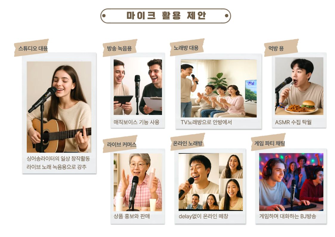 문화강국 대한민국의 핵심인 K-Culture를 더욱 널리 알리고자, 오랜 연구 끝에 BOOMBOX를 개발했습니다. 특히, 영상 분배 기술과 세계 최초 TV용 무선 마이크 기술을 집약한 이 BOOMBOX를 여러분의 TV와 연결하는 순간, 여러분의 공간은 곧, 노래할 맛이 나는 생생한 TV노래방으로 변신합니다.